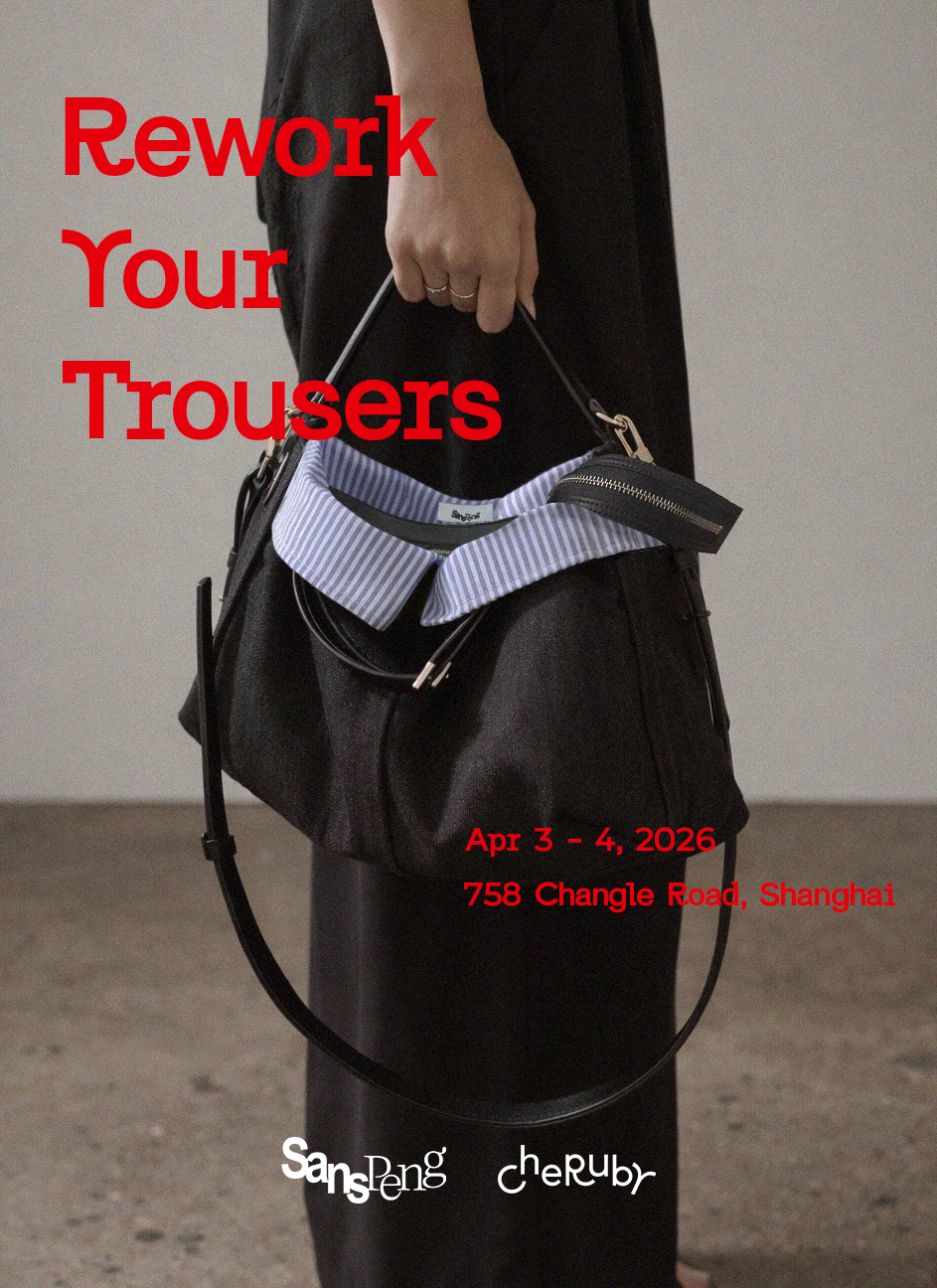 SansPeng × CHERUBY 改造工坊|旧裤重生之我变成了小包包 由SansPeng与CHERUBY共同发起,于2026上海时装周期间特别呈现。作为立足艺术与时尚交叉领域的文化机构,CHERUBY始终关注创作如何在不同语境中被生产、转译与再流通;此次合作,则以“再造(re-make)”为方法,将这一讨论从展览语境延伸至日常使用之中。
